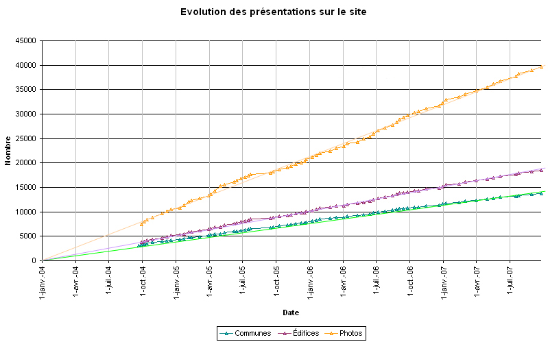 au Coin des contributeurs du 14 juin 2006. Actuellement, le délai de parution sur le site est de plus d'une année, et croyez bien que j'en suis fort marri. J'aimerais le ramener au-dessous de l'année, mais il y a encore deux mises à jour pour avoir terminé septembre 2006, et vient derrière une énorme mise à jour des ajouts de tout 2006 (448 envois), que suivent pas moins de cinq autres mises à jour pour solder les nouveautés reçues en 2006. Comme je ne me vois pas faire huit mises à jour de ce volume en trois mois, je dois me résoudre à accepter, la mort dans l'âme, que ce délai de plus d'une année perdure pendant encore de nombreux mois, voire au moins toute l'année prochaine. Cela dit, il n'y a là aucune raison pour que vous vous restreigniez dans vos envois, vous savez que ces derniers sont sauvegardés à plusieurs endroits et que le rythme n'a jamais baissé comme en atteste le graphique ci-dessous :